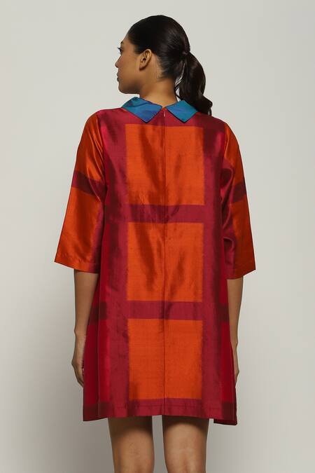 Red Silk Collared Rothko Ikat Pattern Dress