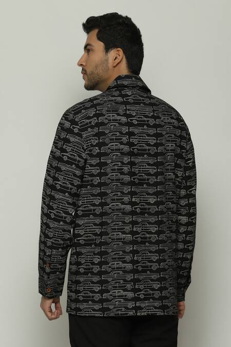 Black button-down shirt featuring a safari car pattern on a poplin base