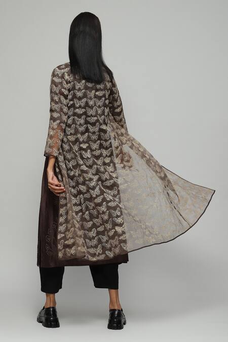 Brown silk organza jacket with butterfly pattern thread work & three quarter sleeves.