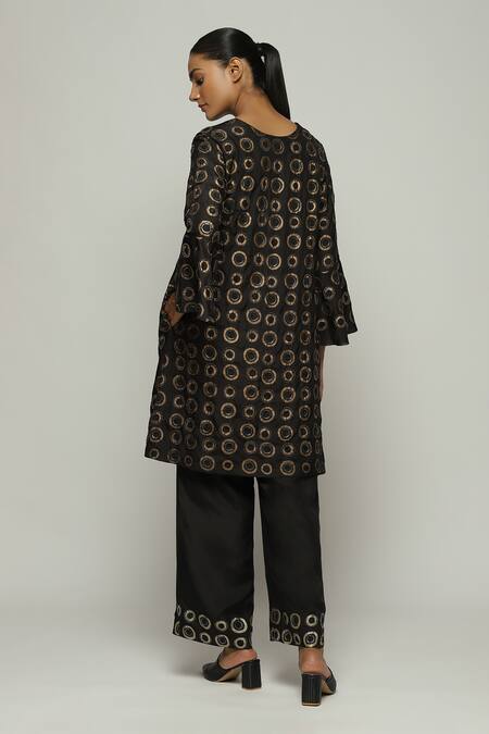 Black Silk Sequins, Beads Round Neck Circle Print Kurta