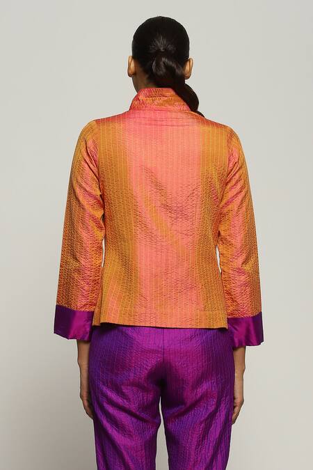 Orange silk shirt featuring thread embroidered stripes and a high collar