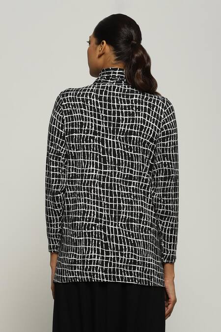 Black Tencel, Lycra Turtle Neck Lattice Print Top