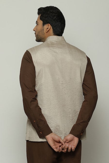 Beige sleeveless bundi crafted from silk with an all-over stripe stitch line detailing