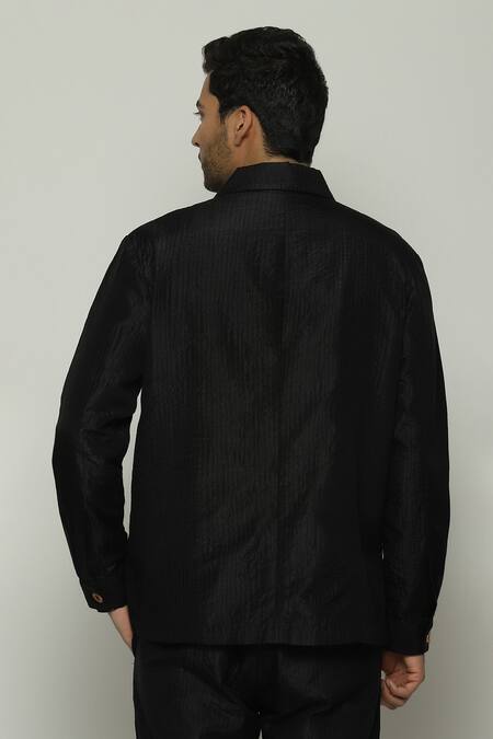 Black jacket featuring full sleeves, collar neckline, and stripe texture in silk
