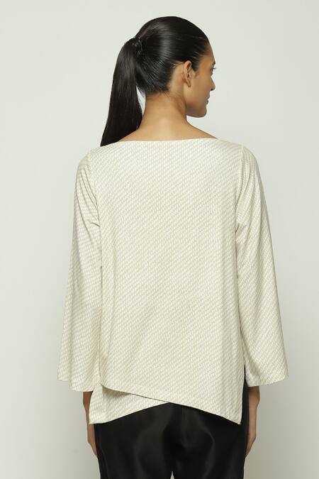 Ivory tencel lycra asymmetric overlap top featuring a twill print