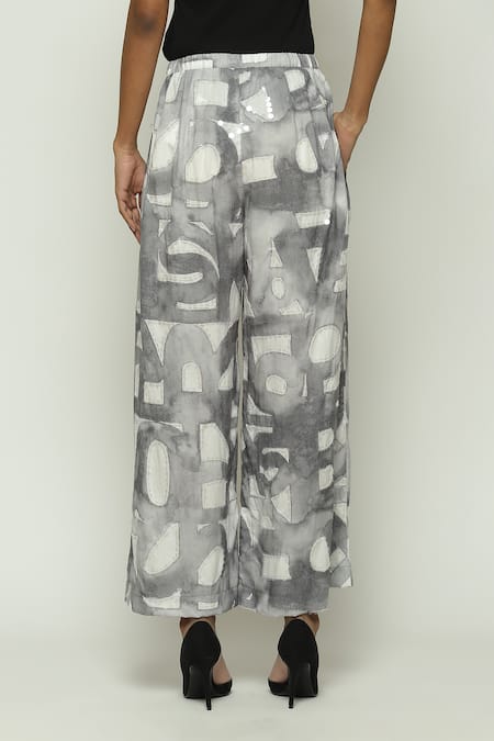White and grey trouser featuring a watercolor calligraphy pattern with side pockets