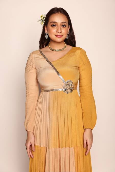 Beige and mustard yellow full sleeves maxi dress featuring an asymmetric V neck and tiered design