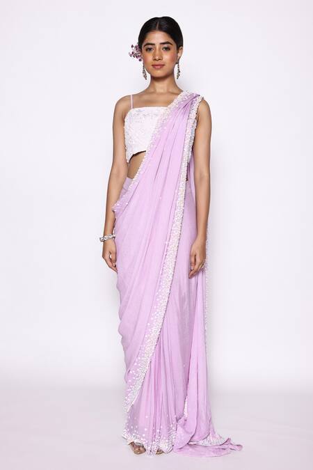 Purple Chiffon, Cotton, Jersey Beads, Embellished Pre-draped Saree With Blouse