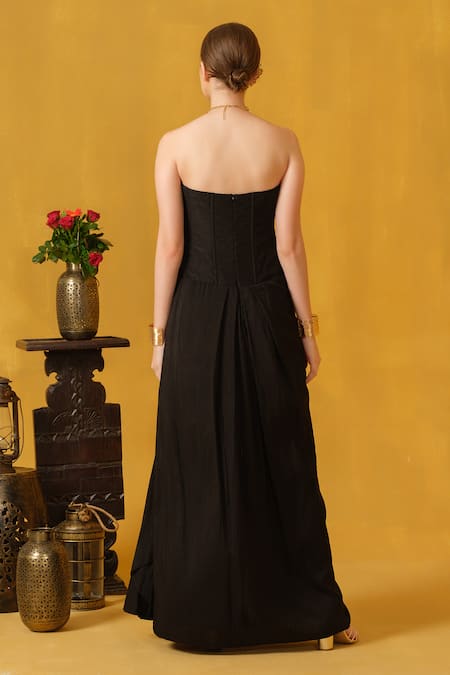 Black corset dress featuring floral brooch embellishments with pipe, sequin, and bead work