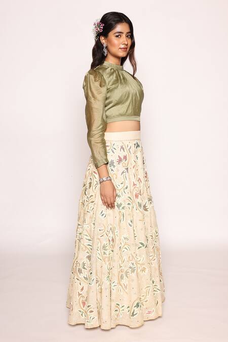 Green silk organza crop top featuring leg of mutton sleeves and a round collar neckline. Paired with a flared skirt adorned with boho fleur applique work using golden sequins, beads, and pipes.