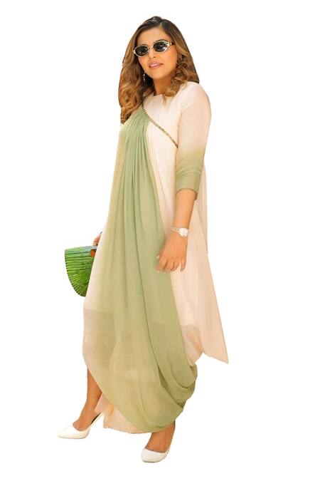 Beige & green ombre draped dress featuring an asymmetrical embellishment with pipes and side cowls