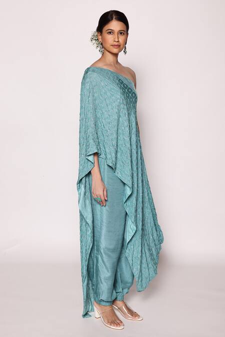 Turquoise blue silk one shoulder draped tunic with side cowl and asymmetric hemline. Paired with a jogger pant featuring a relaxed fit.