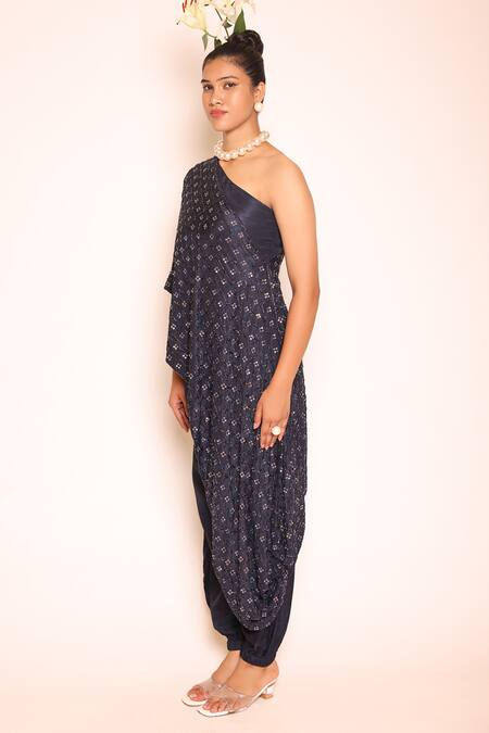Midnight blue silk one shoulder draped tunic featuring a side cowl and asymmetrical hemline with geometrical embroidery. Paired with a jogger pant, both embellished with monochromatic holographic sequins, beads, and pipe work.