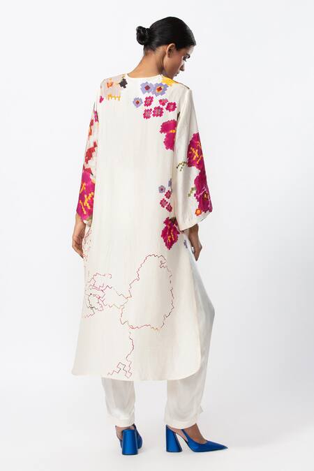 Buy_Saaksha & Kinni_Ivory Silk V-neck Abstract Floral Placement Print Kurta_at_Aza_Fashions