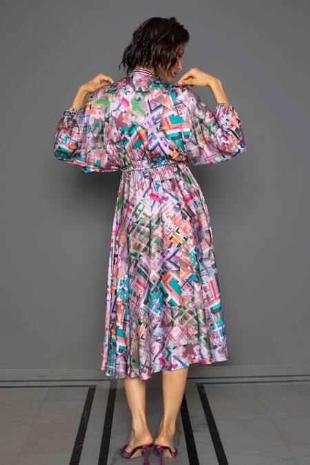 Pink abstract print kimono dress with lace detail on the neck, elastic hem sleeves and elasticated waist with high low pattern in cotton silk fabric.
