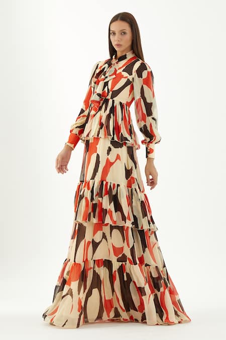 Off white, black, red tiered dress in chiffon base with all over abstract pattern.