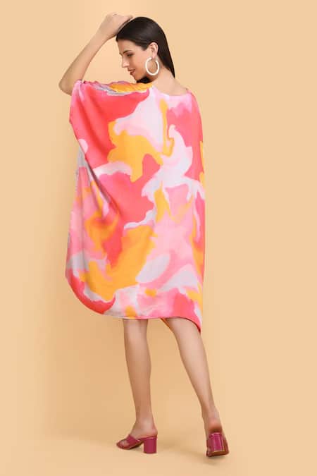 Pink Silk, Satin Keyhole Neck Abstract Print Asymmetric Kaftan