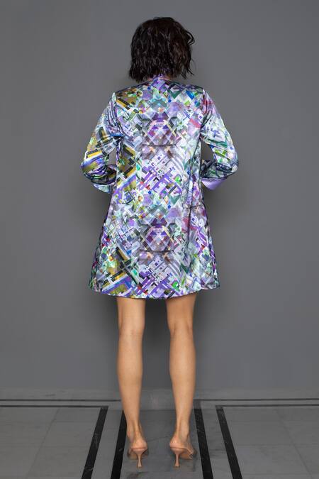 Lilac abstract print long jacket with folded cuff sleeves detail in mashru silk fabric.