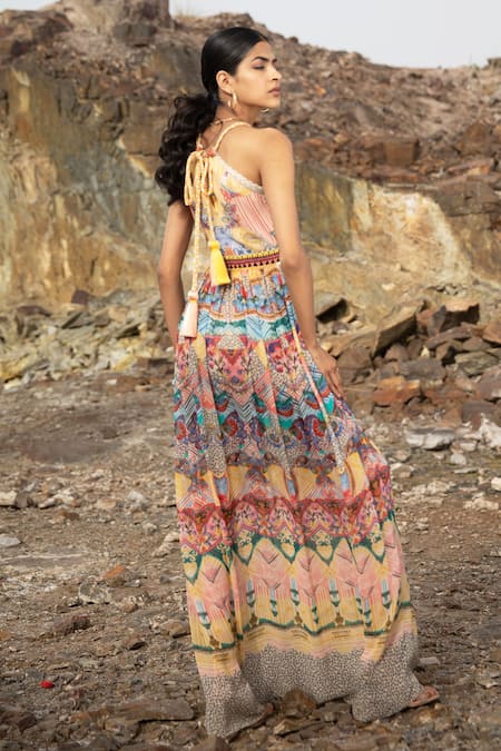Yellow viscose halter neck maxi dress in abstract print and embroidered detail.