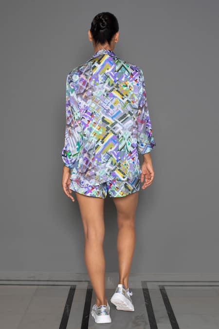 Purple Cotton Silk Abstract Blazer Collar Print Open Style Shirt