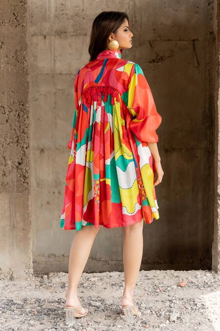 Buy_Pooja-Keyur_Multi Color Satin High Neck Abstract Splash Print Button Dow Dress_at_Aza_Fashions