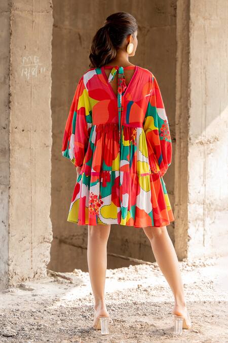Multi color dress featuring a V neck and balloon sleeves