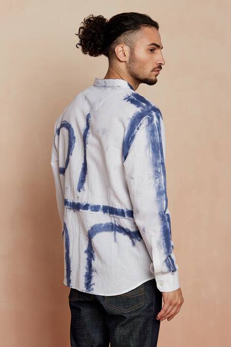 White abstract blue tie-dye shirt with slit pocket & mandarin collar.