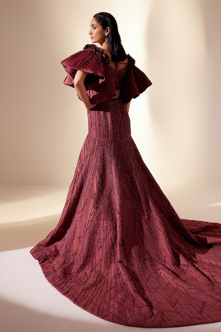 Wine blouse featuring sweetheart neckline with floral applique and sculpted sleeves. Paired with a cancan skirt adorned with intricate cutdana, sequin, bead, and thread embroidery.