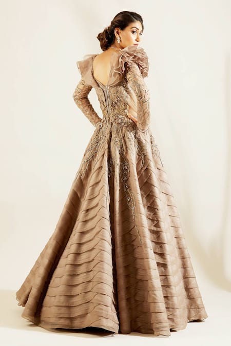 Grey, gold flared gown with striking brush pattern flare, scattered embellishment bodice & layered organza ruffles on shoulder.