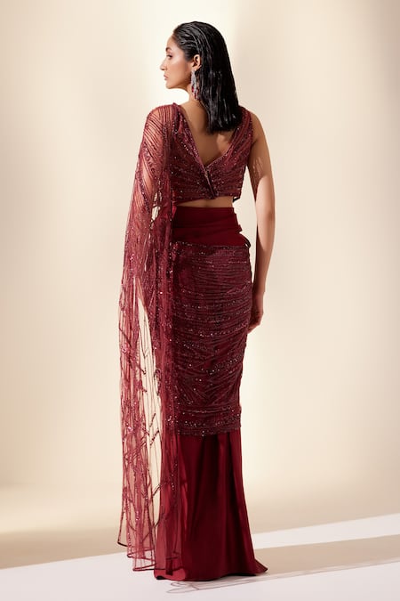 Wine Net, Silk Sizzling Whispers Embroidered Draped Saree Gown