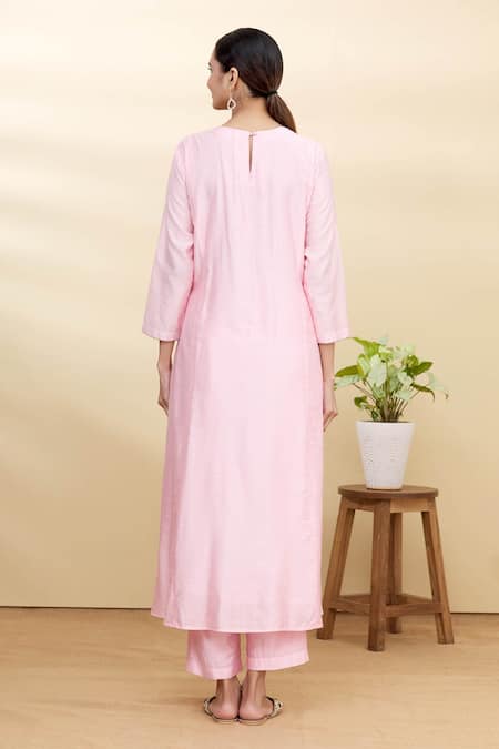 Pink Chanderi, Organza Embroidery Round Neck Embellished Kurta Set