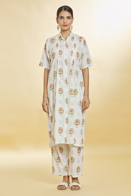 Buy_Naintara Bajaj_White Cotton Collared Floral Block Kurta With Palazzo _Online_at_Aza_Fashions