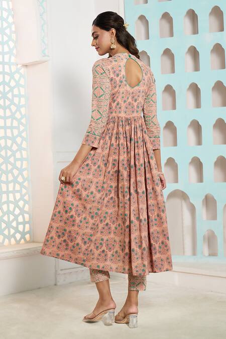Coral Cotton Embroidery High Geometric Pattern Overlapping Anarkali Pant Set