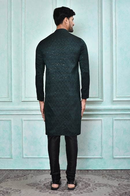 Bottle green geometric patterned kurta featuring sequin embroidery and a mandarin neckline. Paired with a black churidar in a relaxed fit.