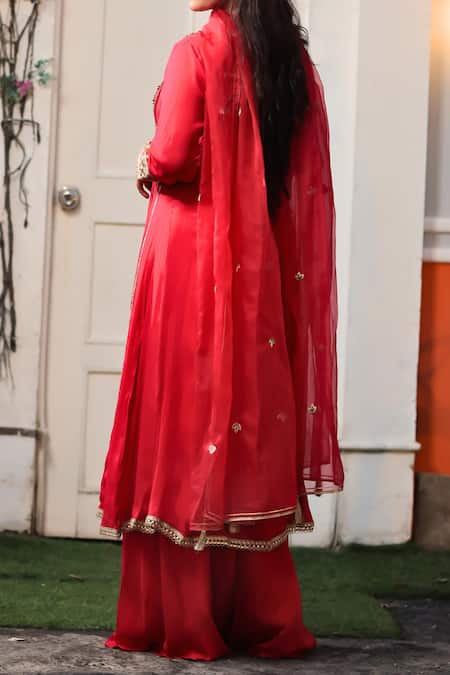 Red kurta featuring rosa thread embroidered patch detailing on the yoke and sleeves. Paired with a flared gharara and embroidered dupatta with bullion leaf motifs.
