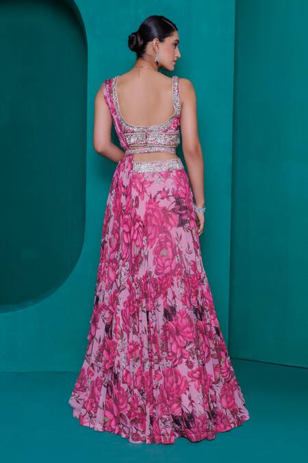 Pink floral printed georgette lehenga featuring silver zari, badla and sequin embroidery with a two-tier style. Paired with a printed and embroidered blouse, dupatta, and waistbelt.