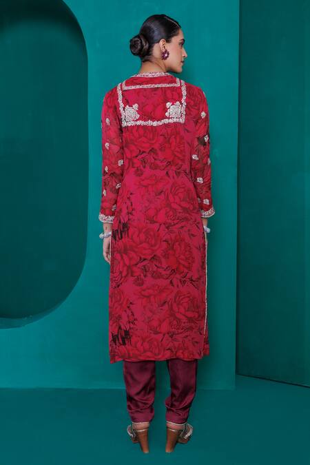 Buy_Adi By Aditya Khandelwl_Red Georgette, Modal, Satin, Organza Embroidery, Floral Print Tunic And Pant Set_Online_at_Aza_Fashions