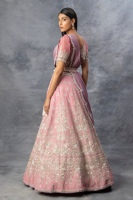 Light pink lehenga with sequin, beads embroidery & pearl latkans. Paired with zari blouse, purple dupatta & embroidered scallop belt.