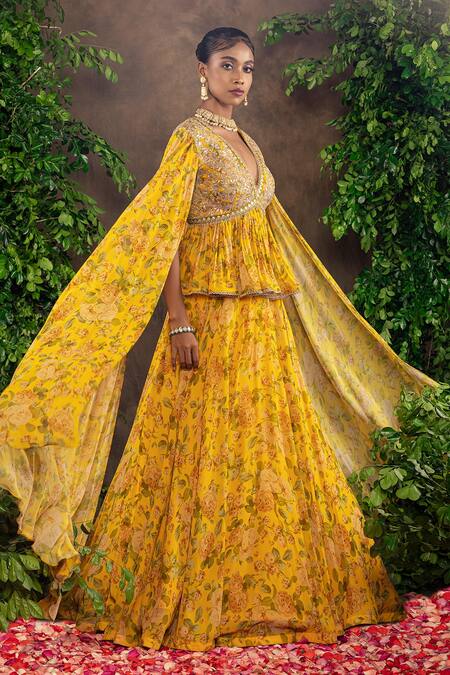 Yellow lehenga with floral printed motif. Comes with cape style blouse.