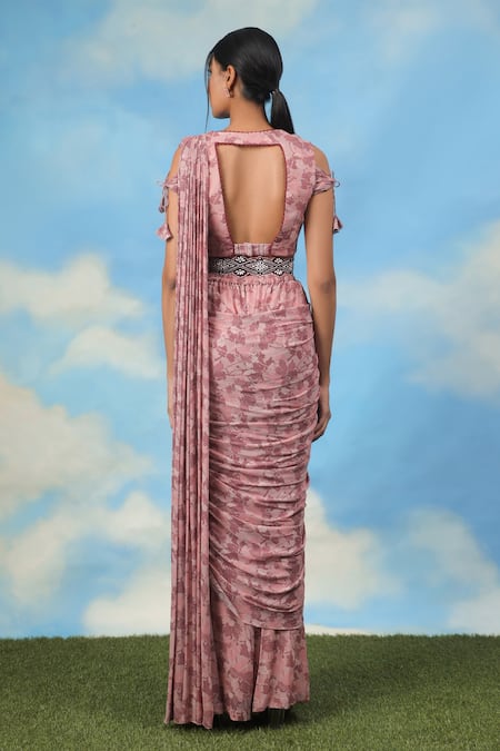 Rose gold palazzo saree with all-over floral digital print. Comes with blouse and embroidered belt.