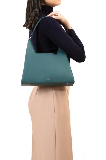 Teal leather structured shoulder bag featuring triangulated geometrical architectural structures