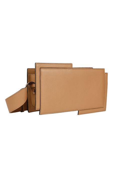 Beige leather clutch featuring a spacious single compartment with a zipper closure. Includes an adjustable broad leather strap for versatile carrying options.