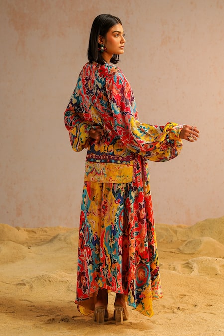 Yellow Organza, Georgette, Satin, Abstract Print Short Kurta And A-line Pant Set
