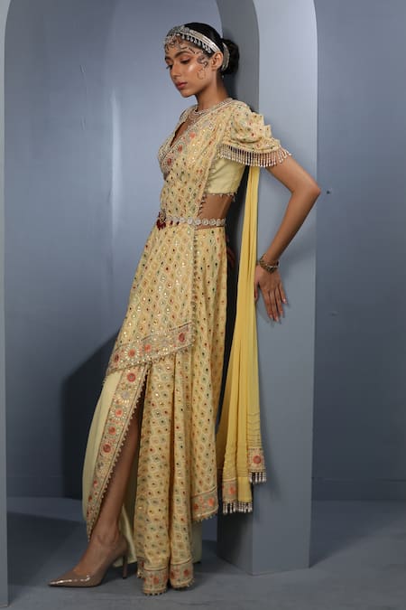Yellow pre-draped saree with floral and gota motifs all-over with pearls. Comes with silk satin drape, zardozi hand embroidery blouse & handcrafted phulkari meenakari belt.