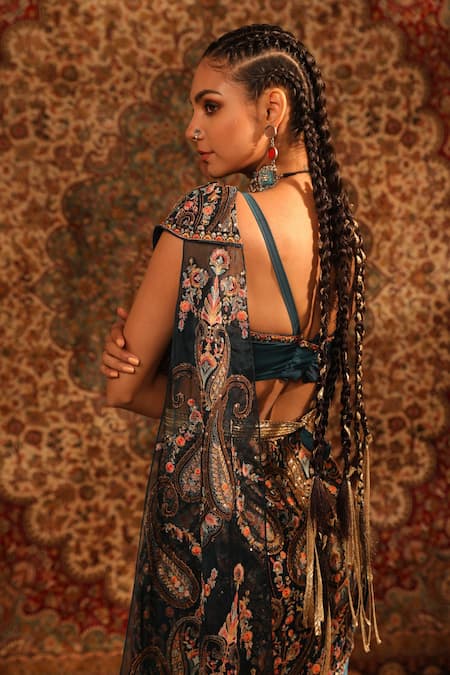 Teal woven satin pre-draped saree featuring an attached draped pallu with jamawar pattern and kashida work. Paired with a sweetheart neck front knotted blouse and an embroidered belt with pearl tasselled hem.