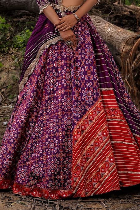 Purple lehenga in banarasi ikat weave with patola work, embellished with mirror. Paired with blouse, heavily hand embroidered in zardozi & resham work. Comes with hand crushed dupatta & Meenakari kamarbandh.