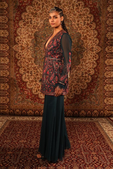 Teal kurta featuring all-over jamawar pattern with kashida embroidery, deep V neck & feather tassel hem on full sleeves. Paired with a flared sharara with side concealed zip closure.