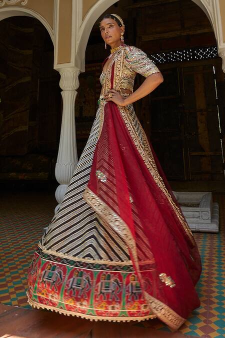 Black, white lehenga with abstract stripes, patola print on the hem, gota patti trims and an attached overlay. Comes with embroidered multicolor blouse, sheer dupatta and meenakari belt.