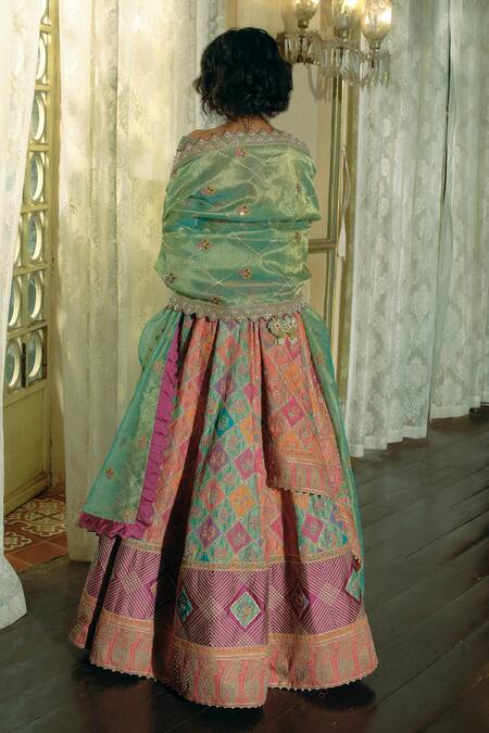 Pink lehenga featuring intricate zardosi and zari embroidery with an asymmetrical side panel. Paired with a padded blouse adorned with paisley embroidery and a dupatta embellished with floral embroidery and pearl tassels.