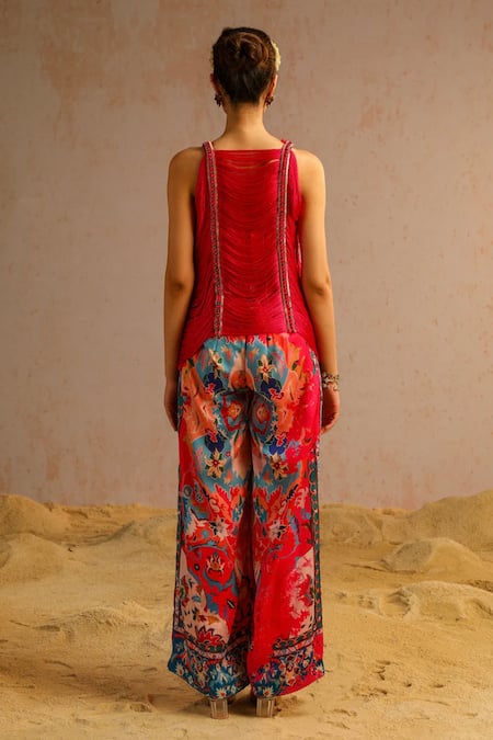 Hot pink top featuring zardosi, aari, sequins, pearls and thread embroidery. Paired with abstract motifs printed flared pant.